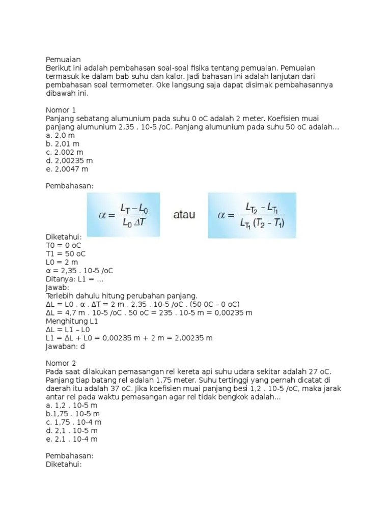 Disini admin anakpintarmalang akan memberikan soal pemuaian kelas 7 serta pembahasan nya :) mari kita mulai :) soal: Soal latihan fisika smp kelas vii materi pemuaian 1 (problem solved vii class matter physics smp expansion 1). Soal ipa smp fisika kelas vii . Pada latihan soal suhu dan pemuaian yang admin susun untuk mengukur kemampuan fisika shobat. Artikel fisika kelas 7 kali ini akan membahas mengenai proses pemuaian yang terjadi pada zat padat.